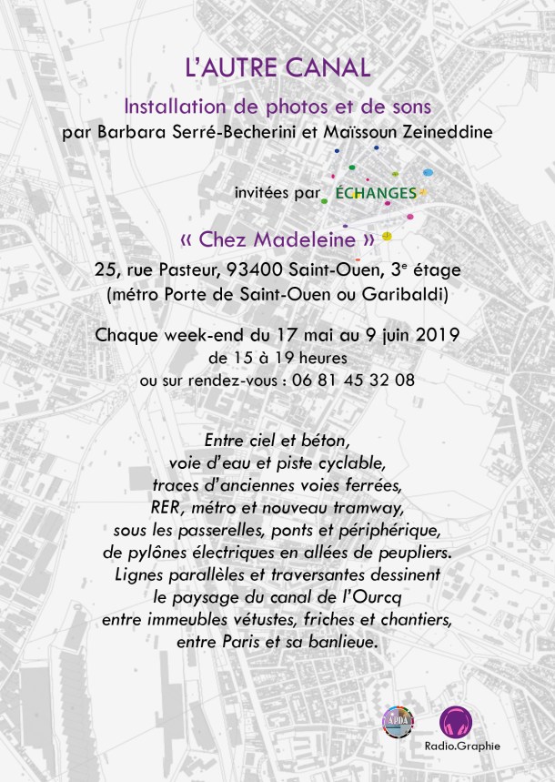 Photographe et preneuse de son, nous nous sommes mises à arpenter plus systématiquement les abords du canal, de 2014 à 2018, dans un secteur circonscrit, du boulevard Périphérique au pont de Bondy couvrant les communes de Paris, Pantin, Bobigny, Noisy-le-Sec et Bondy. Comment ce terrain est-il occupé, habité, utilisé, fréquenté, traversé ? Parallèlement dans le cadre de l’aménagement du Grand Paris, c’est une « zone » en transformation, où de l’ancienne « zone des fortifs » aux anciennes « zones industrielles », tout est devenu « zone d’aménagement concerté ». C’est durant la fin des friches et le temps des chantiers, avant la création des nouveaux quartiers, que nous avons mené notre projet.